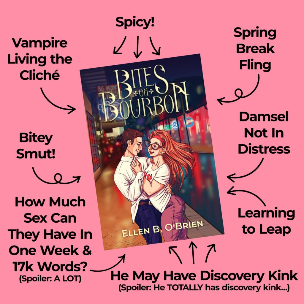 A vampire romance novelette set in 1994 New Orleans. Available for purchase in e-book and print through Amazon and other booksellers. You can find (or leave) reviews for Bites on Bourbon on Goodreads, Storygraph, Romance.io, Indie Story Geek, and Indie Authors Central.