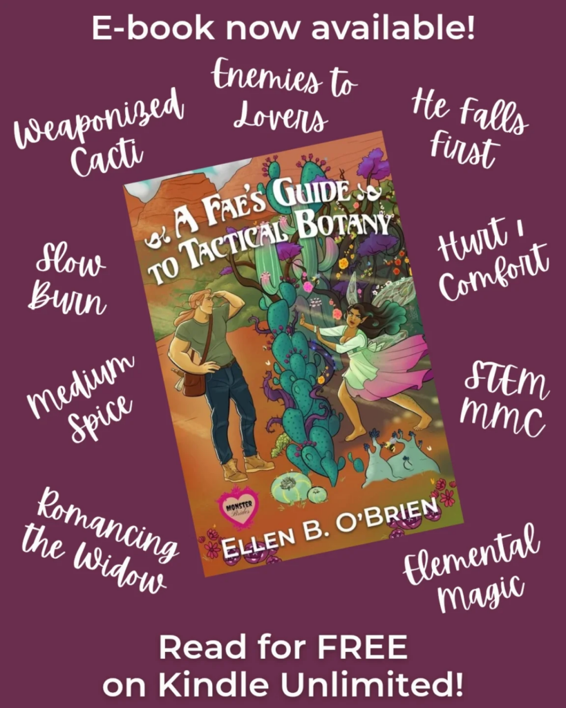 A Fae’s Guide to Tactical Botany is a story of grief and recovery, joy after loss, with an enemies-to-lovers vibe, a damsel not in distress, a knight in not-so-shining armor, academic ambitions, bees, siege towers, drones, a lime green Jeep, cacti, mead, carpentry, yearning, smut, and one padded particolor codpiece. Jump to Content Warnings.